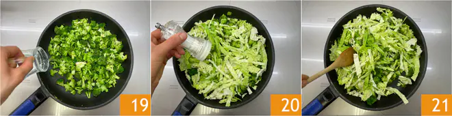 Pour 2 tablespoons of water 19 and continue cooking for another 5 minutes. Add the savoy cabbage, adjust the salt 20, and sauté for 10 minutes 21, or until the vegetables are cooked. Let cool.
