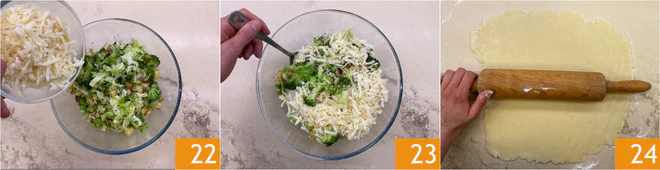In a bowl, combine potatoes, vegetables, grated fontina cheese 22 and mix 23. Roll out the shortcrust pastry with a rolling pin on a floured surface until it approximately 1/4 inch thick 34.