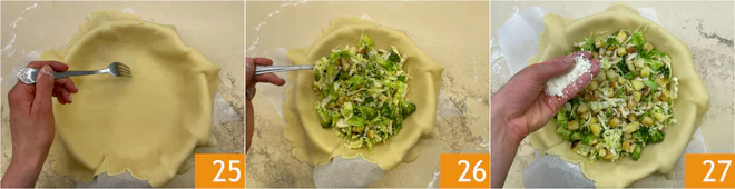 Line a 10-inch diameter flared mold with parchment paper and place the pastry inside, using the rolling pin to transfer it. Prick the bottom with a fork 25. Fill with potatoes, vegetables, and fontina cheese 26. Add a sprinkle of Grana Padano 27.