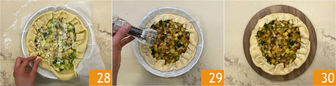 Fold the edges of the pastry inward, creating folds 28, and bake in a static oven at 392°F (200°C) for 30 minutes. Remove from the oven, let cool slightly, and add a sprinkle of pepper 29. Your autumn galette is ready to be served 30!
