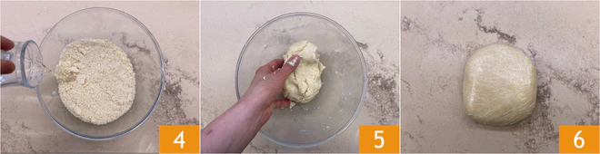 Add the cold water 4 and work the mixture quickly until you obtain a smooth dough 5. Wrap it in plastic wrap 6 and let it rest in the refrigerator for 30 minutes.