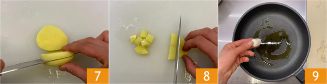 Peel the potatoes and cut them first into slices 7 and then into cubes about 1/2 inch 8. In a pan, pour a drizzle of oil and add the crushed garlic clove 9.