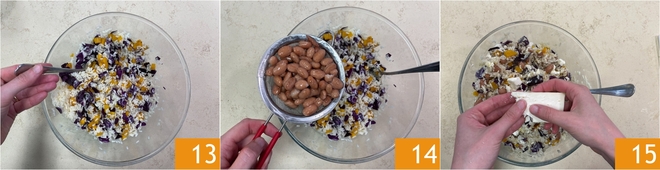 Mix again 13. Rinse the Borlotti beans, drain them, and pour them into the bowl 14. Also, add the Quartirolo cheese, crumbling it roughly with your hands 15, and pepper to taste.