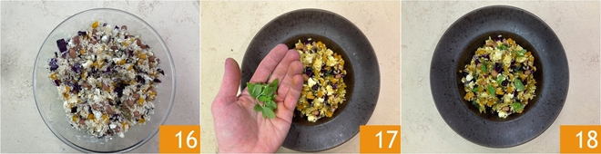 Mix well 16, then plate it. Decorate with thyme and marjoram leaves 17, then serve 18.