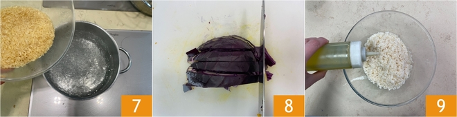At this point, cook the rice according to the times indicated on the package 7. Wash the red cabbage well and cut it into thin strips first one way and then the other 8 to get small squares. Drain the rice al dente and transfer it to a bowl; season with oil 9.