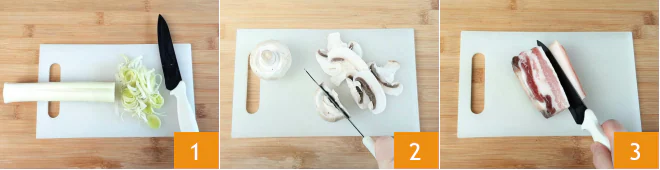 To prepare the autumn risotto, start by putting a pot with vegetable broth on the heat, keep it warm. Meanwhile, slice the cleaned leek into thin rounds 1. Then cut the cleaned champignon mushrooms, if you want to see how we explain it in our cooking school, and chop them into coarse cubes 2. Finally, remove the rind from the pancetta 3