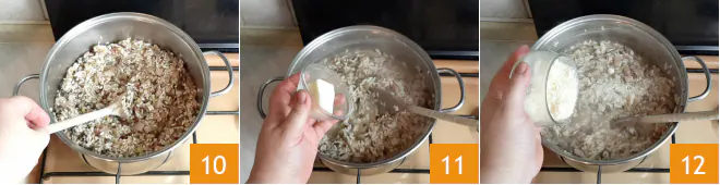 Remember to stir occasionally but not excessively; broth, pancetta, and cheese, at the end of cooking, are all salty ingredients, so choose whether to add more salt, perhaps paying attention to the amount 10. At the end of cooking, turn off the heat and add the butter 11 and grated cheese 12 while stirring.