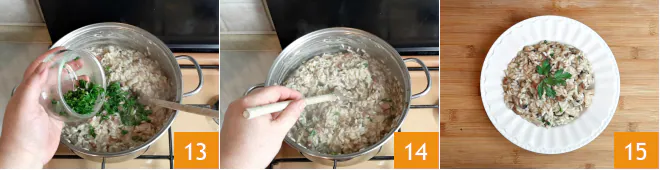 Fragrance with a bit of chopped parsley 13, give it one last stir 14, and your autumn risotto is ready to be served 15.