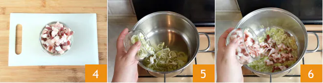 and cut it into strips about 0.4 inches thick 4. Move to the stove. In a saucepan, add a swirl of oil and the leek: cook over low heat for a few minutes 5. Add the pancetta and cook it at the same temperature for a couple of minutes, stirring frequently, this way the fat will melt 6.