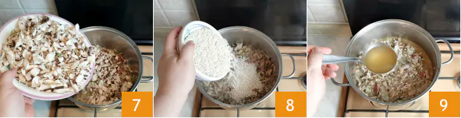 It's time to add the mushrooms to the saucepan, stir, and let them soften for 7-8 minutes 7. Add the rice and mix well 8: toast it for a few minutes until it becomes transparent. Then proceed to cook the risotto by adding the hot broth one ladleful at a time as it dries out 9.