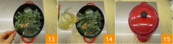 When the leek is stewed, add the diced pumpkin 10, shelled beans 11, and black cabbage 12.