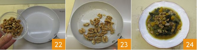 Now place the walnut kernels in a very hot pan 22 (you can leave them whole or coarsely crumble them), toast them for 3 minutes to brown them by shaking the pan to prevent burning 23, then add them to the soup. Serve the autumn soup hot 34 accompanied by toasted bread croutons.