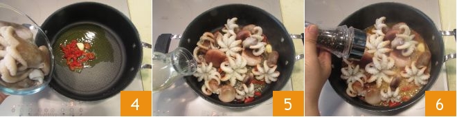 Then add the baby octopus 4 and cook over high heat for 3-4 minutes, stirring often. Deglaze with the wine 5 and let it evaporate, then add salt and pepper 6.