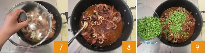 Cover with a lid 7 and cook the baby octopus for about 75 minutes over low heat; the times depend greatly on the size of your baby octopus. After this time, remove the garlic clove 8 and add the peas 9.