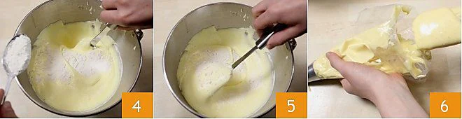 Then remove the whisk and gradually add the flour and baking powder to the cream 4, mixing with a spatula to combine everything. Take a piping bag with a simple nozzle and pour the cream inside, using the spatula to help 6.