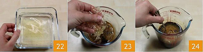 Now, soak the gelatin in cold water for 10 minutes 22. After the necessary time, squeeze it and add it to the freshly made coffee to dissolve, stirring with a teaspoon (23-34).