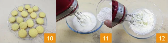 After the baking time, you can remove them from the oven and place them on a wire rack to cool 10. While the shells cool, focus on the filling, starting with the whipped cream: take a clean bowl, pour in the cold fresh cream from the fridge and turn on the clean electric beaters, adding the icing sugar little by little 11, then continue to whip until the cream is fluffy 12 (for a detail on this operation follow our cooking school: How to Whip Cream). Transfer the whipped cream into a pastry bag with a star-shaped nozzle and the jam into another pastry bag with a plain nozzle (if you don't have nozzles, you can still use two disposable pastry bags and just cut the tip).