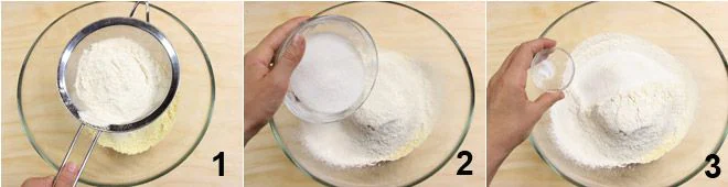 To prepare the lady's kisses with cornmeal, sift together the cornmeal and all-purpose flour in a large bowl 1, then add sugar 2 and the seeds from a vanilla bean or, if you don't have it, vanilla extract or vanillin 3.