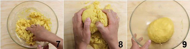 and start kneading 7. When the mixture starts to become compact, transfer it to a floured board and continue working it with your hands 8. Form a ball 9, cover it with plastic wrap, and let it rest for at least half an hour in the refrigerator.