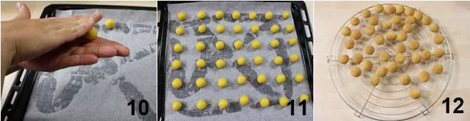 After the necessary time has passed, line a baking sheet with a sheet of parchment paper and start forming small balls, slightly flattened on one side, with the dough 10, then place them on the baking sheet (let them rest again in the refrigerator if the dough is too soft) and bake them at 356°F for 20 minutes 11. Once baked, let them cool on a rack 12