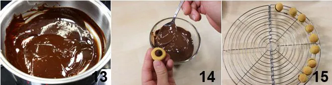 and prepare the filling by melting the dark chocolate in a bain-marie 13. When the cookies are cold, place a few drops of melted chocolate on the flat side of a cookie 14 and close with a second cookie. When the chocolate solidifies, the cookies will stick together, forming a fragrant ball with a chocolate filling 15.