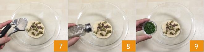Using the appropriate tool, mince the garlic directly into the mixture 7, salt and pepper to taste 8, and also add the chopped parsley 9.