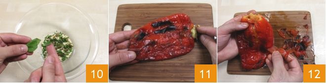 Finally, break the basil leaves with your hands and add them to the filling. When the peppers have cooled, remove the green stem 11 and peel them 12: the skin will come off easily, but during this operation be careful not to break them.