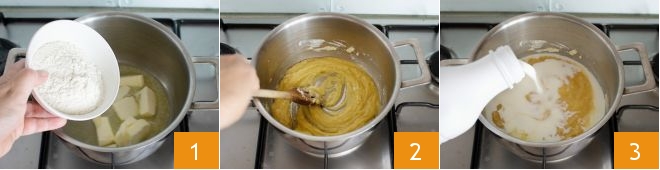 To make the baked conchiglioni with prawn and hake ragout with saffron, first prepare the béchamel: place the soft butter and flour in a saucepan 1. Turn on the low heat and quickly stir with a wooden spoon 2. With the heat, the butter will melt and create a sort of golden cream with the flour. Pour in the milk 3