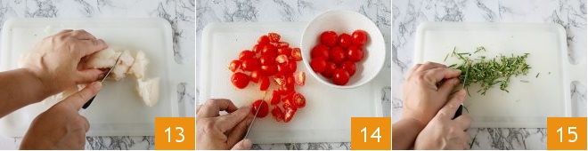 Also cut the hake into pieces 13. Now wash the cherry tomatoes and cut them into 4 parts 14. Remove the needles from the rosemary and chop them finely 15. Meanwhile, place a pot full of salted water on the stove, which will be used for cooking the pasta.