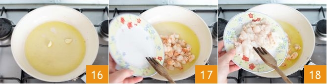 In a pan, heat a drizzle of extra virgin olive oil and brown a garlic clove cut in half 16. Add the prawns 17 and then the hake 18.