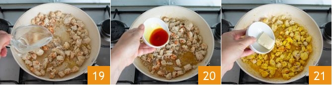 Sauté for just a couple of seconds and add a pinch of salt, a pinch of pepper, and a pinch of nutmeg and stir. Deglaze with the white wine 19 and let it evaporate. Also add the saffron dissolved in 3-4 tablespoons of hot water 20 and stir, then add the butter 21