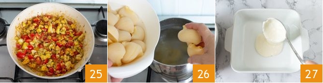 Turn off the heat and let the prawn and hake ragout cool 25. Now, cook the pasta very al dente, adjusting according to the cooking time indicated on the package 26. In a 9.5 x 9.5-inch baking dish, pour a ladle of béchamel on the bottom 27.