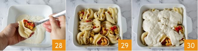 Stuff each conchiglioni with the prawn and hake ragout 28 and place them on the baking dish 29, then cover with the béchamel 30.