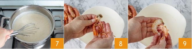 and stir until the béchamel thickens 7. Shell the prawns by removing the head, the legs 8, and then the shell 9.