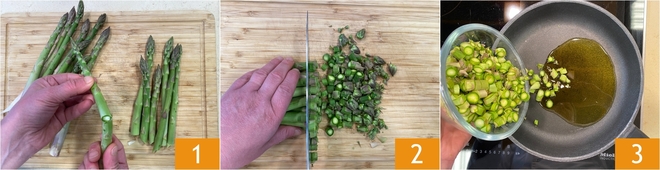 To prepare the baked frittata with asparagus and ricotta, start by cleaning the How to clean asparagus: remove the tougher bottom end by snapping it off with your hands 1, then gather the stalks and slice them into rounds 2. Heat a drizzle of olive oil in a skillet and add the asparagus 3.