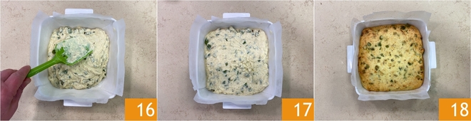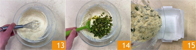 Mix until you obtain a homogeneous mixture 13. At this point fold in the now-warm asparagus, combining well with a spatula 14. Pour the mixture into an 8x8 in baking pan lined with parchment paper 15.