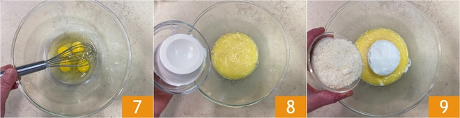 Meanwhile, break the eggs into a bowl and whisk them 7, then add the ricotta 8 and the grated Grana Padano 9.