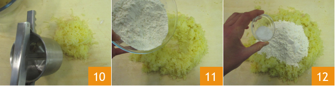 When the potatoes are cooked, mash them hot on a work surface using a potato masher 10, then add the flour 11 and salt 12.