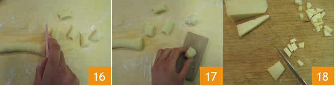Cut the logs into pieces with the help of a dough scraper 16 and roll each one on a gnocchi board or the tines of a fork, pressing lightly with your thumb 17. Place the gnocchi on a floured cloth and put a pot with plenty of water on the stove to bring to a boil. Meanwhile, dice the cheese 18.