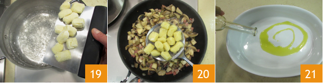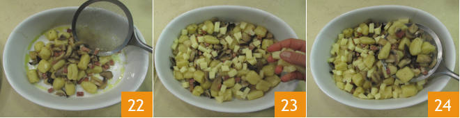 Drop the gnocchi into the boiling water 19. As soon as they float to the surface, drain the gnocchi and pour them into the pan with the seasoning 20, then sauté on high heat for a few seconds, mixing well. Now take a baking dish and oil the base with a drizzle of oil 21.