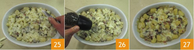 Finish with the remaining diced cheese, add a few knobs of butter on top 25, and sprinkle with grated Grana. Season with a grind of pepper 26 and bake in a preheated ventilated oven at 392°F for 10 minutes, then turn on the grill and brown for 3 minutes. Your mushroom au gratin gnocchi are ready to be served 27!