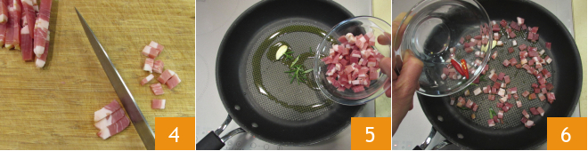 Cut the slice of prosciutto into cubes 4. In a large frying pan, pour a drizzle of oil and sauté the garlic clove with rosemary for 1-2 minutes, then add the prosciutto 5 and the halved chili 6 and increase the heat for 3-4 minutes.