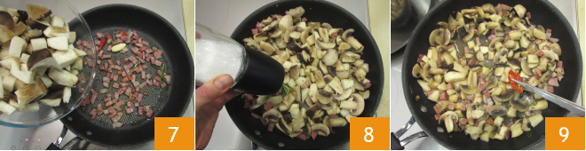 At this point, add the mushrooms 7, salt 8, pepper, and cook over low heat for about 15 minutes. After this time, remove the garlic and the chili 9 and set aside.
