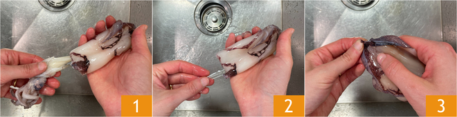 To prepare the baked gratined squid with cherry tomatoes and olives, first dedicate yourself to cleaning the squid: detach the tentacles from the mantle 1 and remove the cartilage pen inside it 2. Rinse under running water and use your hands to remove the innards found in the mantle. Use a small knife to cut the end of the mantle and remove the outer skin 3.
