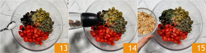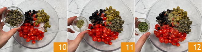 Also add the desalted capers 10, dried oregano 11, and dried chives 12.
