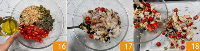Do the same with the black olives 7. Add the cherry tomatoes to the bowl with the squid 8, along with the black and green olives 9.