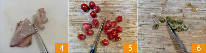 Cut the mantle into rings about 0.8 inches thick 4. Finally, separate the eye from the tentacles and place them in a bowl along with the squid rings. Now, cut the cherry tomatoes in half 5 and the green olives 6.