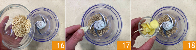 In a blender, place the pine nuts 16, a clove of garlic 17, and the ginger 18.