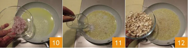 add the chopped shallot 10 and let it soften for 10 minutes, adding a little warm water 11, then add the champignon mushrooms 12,