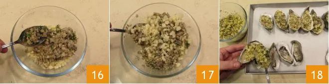 and place it in a bowl, add the sautéed mushrooms 16, and mix the breadcrumb topping 17. Take the cleaned shells, insert the mollusk in each, and cover with the mushroom breadcrumb topping 18.